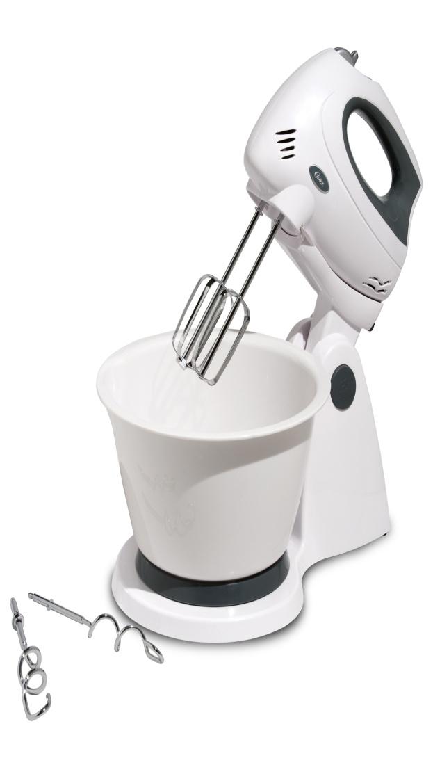 002610-013-000 - BATIDORA MANUAL, con Pedestal, Mango Ergonómico, Función de Mezclado Automático, la Cabeza se Separa de la Base para Usarse de Mano, Motor 250W, Tazón de Plástico Giratorio de 2.5 Lt., Blanco.