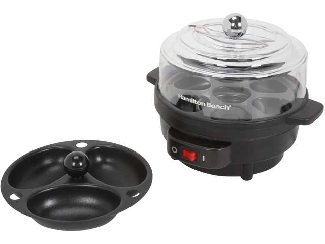 25500 - COCEDORA DE HUEVOS HAMILTON BEACH, para 7 huevos, Duros, Cocidos, Suaves, Blandos y Escalfados, Bandeja Antiadherente, Temporizador con Timbre Indicador, Taza Medidora.