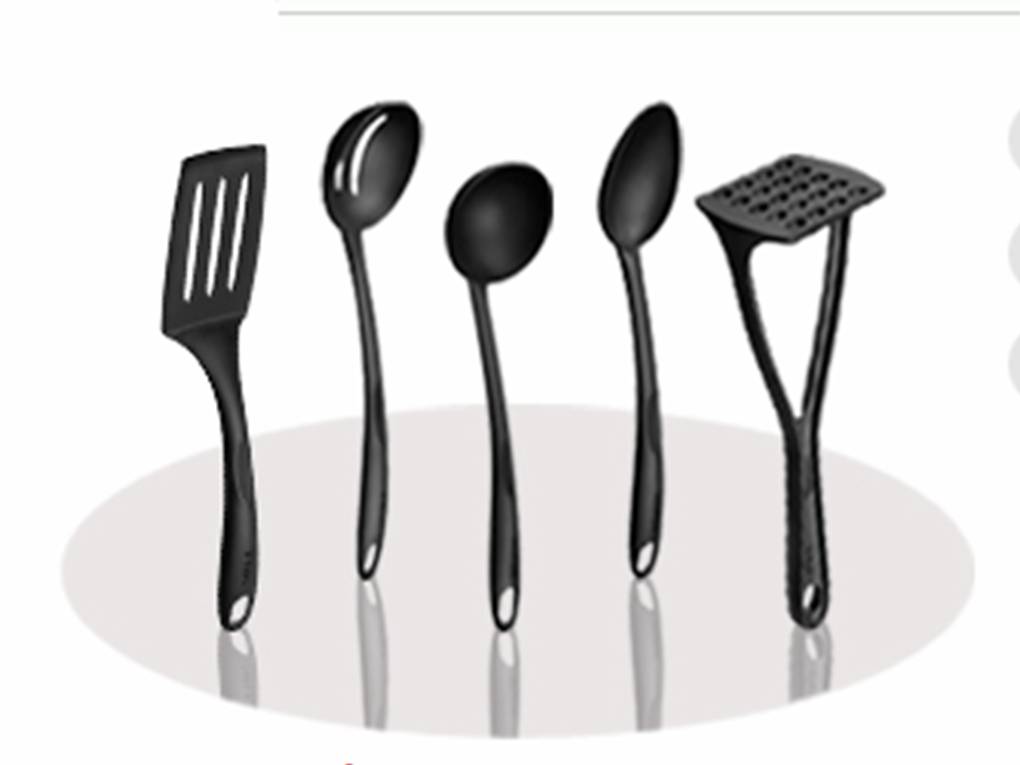 27446003 - JUEGO 5 PZS (VOLTEADOR CORTO, VOLTEADOR LARGO, CUCHARA ESCURRIDORA, CUCHARA LISA, CUCHARON) + CAJA, Nylon, Hasta 220°c, Negro, Case Pack con 10 pz.