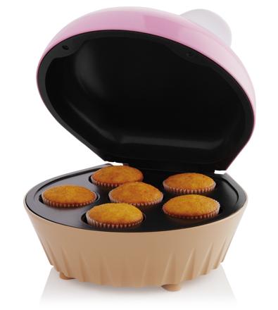 FPSBCML900-0NP - MÁQUINA PARA CUPCAKES, Capacidad para 6 Cupcakes, Manija Fácil de Levantar y Fría al Tacto, Rosa, en Forma de Pastel, Indicador Luminoso de Encendido, Placas con Recubrimiento Antiadherente, 900W, Patas Antiderrapantes y Frías al Tacto.