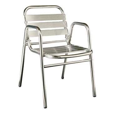 SILLÓN APILABLE PARA EXTERIOR, Estructura Tubular Doble, Aluminio Anodizado Brillante, Asiento y Respaldo en Lamas de Aluminio Estriado Brillante, Tornillos de Acero Inoxidable, Tuercas Autoblocantes y Conectores de Aluminio.